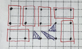はじめ,$3\times 5$ や $3\times 7$ などで(プログラミングすらせず手作業で)適当にすぐ見つかるだろうと予想していたのですが,これは失敗でした.これは例えば $3\times 5$ には $(2i,2j)$ に相当する点が $6$ 個あり,$5$ 個の三角形のうちどれか $1$ 個はこの種類の点を $2$ 個使ってしまうからです.