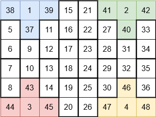 基本的な発想は,マッチングプレイです.$2$ マスずつペアにして $x, x+1$ を書いておきマッチングプレイをすれば,相手より高々 $HW/2$ 大きい程度で済むのでそこから少し改善できれば大丈夫という方針です.